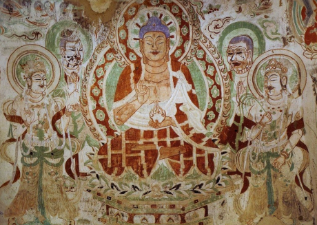 上图为敦煌壁画,规模巨大,技艺精湛。敦煌壁画的内容丰富多彩,它和别的宗教艺术一样,是描写神的形象、神的活动、神与神的关系、神与人的关系以寄托人们善良的愿望,安抚人们心灵的艺术。
