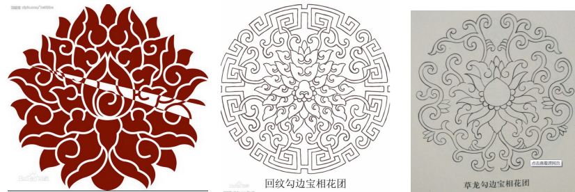 佛教中宝相花也是一种代表性纹路,佛教中用“宝相庄严”一词称谓佛相,因此得名宝相花。宝相花一般以某种花卉(如 牡丹 、菊花、莲花)为主体,中间镶嵌着形状不同、大小粗细有别的其它花叶组成。尤其在花芯和花瓣基部,用圆珠作规则排列,象闪闪发光的宝珠,加以多层次退晕色,显得富丽、珍贵。宝相花也和卷草纹回形纹一起组合形成新的图案。