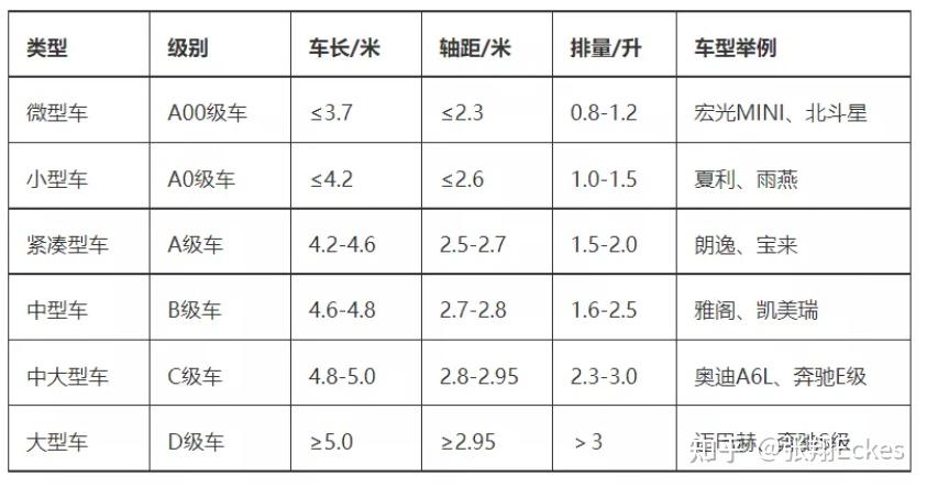 狭义上的汽车(家用车、乘用车),基于车身尺寸不同,有一些“紧凑型车”“中型车”的车级划分标准,大致如下。但感觉现在95后、00后年轻人好像不怎么用这种说法了。