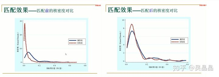还包括: 共同支撑检验(common support检验):主要检验的目的是为了确定针对每个处理组,都有对照组与之匹配,一般可以通过倾向匹配得分的分布进行观察,看是否符合,对于没有找到对照组的处理组,去掉其样本 主要对匹配前后的核密度图进行对比,最好的结果是匹配之后两条线很相近。有的时候也会用第二章条形图。