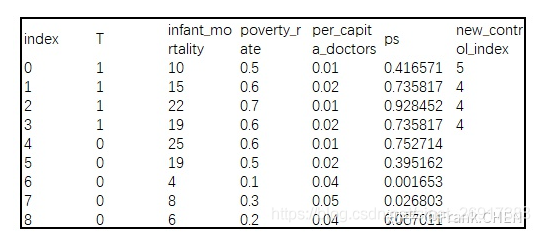 计算出Propensity Score后,在对照组中需要寻找到与实验组行为(贫穷率、人均医生数)相似的村庄,此过程被称为Matching。 在这里我们采取最简单的临近匹配法,对每一个实验组村庄进行遍历,找到ps值最接近的对照组村庄作为新对照组集合中的元素,即为new_control_index。