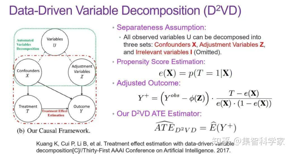 以上的这三种基于倾向指数的方法比较粗暴,把干预变量和结果变量之外的所有变量都当作混淆变量。而在高维数据中,我们需要精准地找出那些真正需要控制的混淆变量。我们提出了一种数据驱动的变量分解算法(D²VD),将干预变量和结果变量之外的其他变量分为了三类: