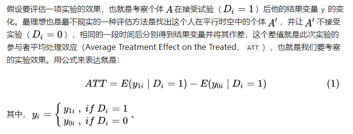 估计ATT最理想的方法是找到参与实验的个体在平行时空的自己,并假设平行时空的自己没有参与实验,最后作差得出最纯粹的ATT,但是找到平行时空的自己不现实; 退而求其次,我们可以使用随机分组的处理组与控制组,作差得到ATT,但现实中个体是否参与实验的选择不随机; 为了得到随机化分组的样本,找出影响个体是否参与实验的因素,控制两组间因素的取值相等,最后利用处理后的分组样本作差得到ATT。