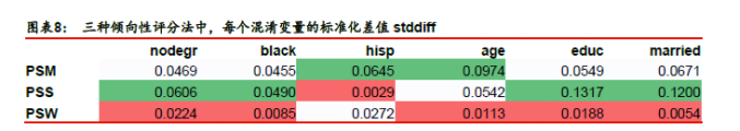 图表8展示了各倾向性评分方法中,每个混淆变量的标准化差值stddiff。总体来看,倾向性评分加权法(PSW)中各混淆变量的标准化差值最小(除了hisp),说明PSW中混淆变量在处理组和对照组间较均衡,其因果效应估计值可能更可靠。