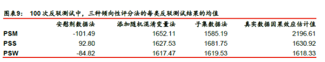 图表8展示了100次反驳测试中,三种倾向性评分法的每类反驳测试结果的均值。我们将三种倾向性评分法在真实数据下的因果效应估计值放在图表9最右侧进行对比。 在安慰剂数据法中,由于生成的安慰剂数据(Placebo)替代了真实的处理变量,每个个体接收培训的事实已不存在,因此反驳测试中的因果估计效应大幅下降,接近0,这反过来说明了处理变量对结果变量具有一定因果效应。 在添加随机混淆变量法和子集数据法中,反驳测试结果的均值在1585.19~1681.75之间。
