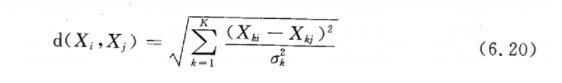 距离。一般的欧式距离、标准化的欧式距离、马氏距离。后两者距离测度方法消除了量纲(or 单位)的影响。下面展示一个标准化欧式距离的公式: