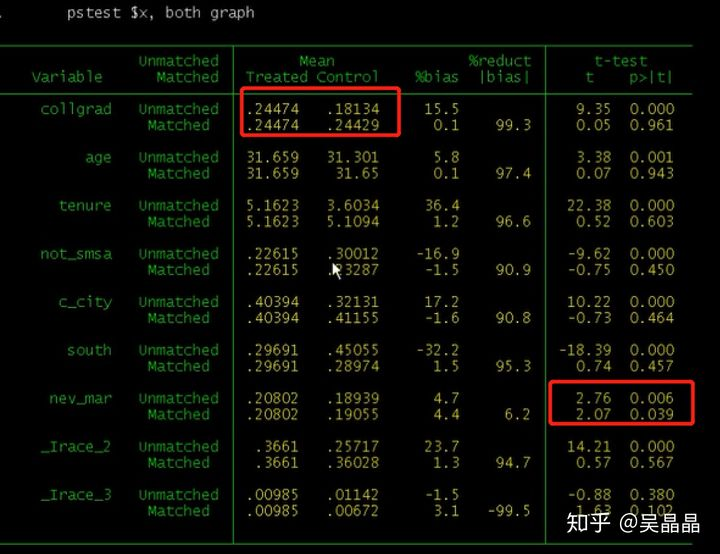 平衡性检验 追求的目标:匹配前后各个变量的均值之间没有明显差异(均值偏差小,t值之小不显著)。主要是下面的表格和图。