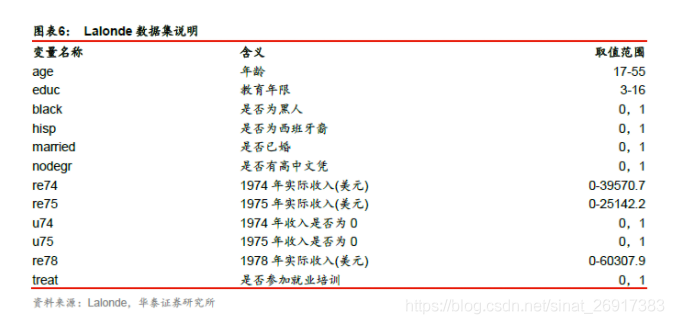 Lalonde数据集是因果推断领域的经典数据集 数据集共包含445个观测对象,一个典型的因果推断案例是研究个人是否参加就业培训对1978年实际收入的影响。 treatment变量,就业培训与否0/1 混淆变量为age、educ、black、hisp、married、nodeg。