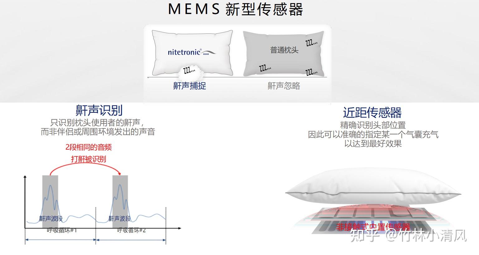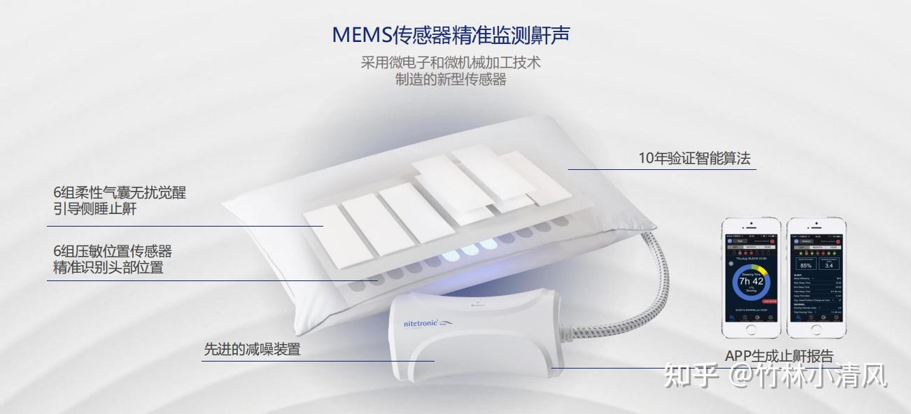 在人熟睡打鼾时, MEMS的鼾声传感器 精准识别并分析出鼾声,联动枕头内部的 6部压敏位置传感器 和 6组气囊 ,主动干预引导,进行改变打鼾者的睡姿,减少打鼾。