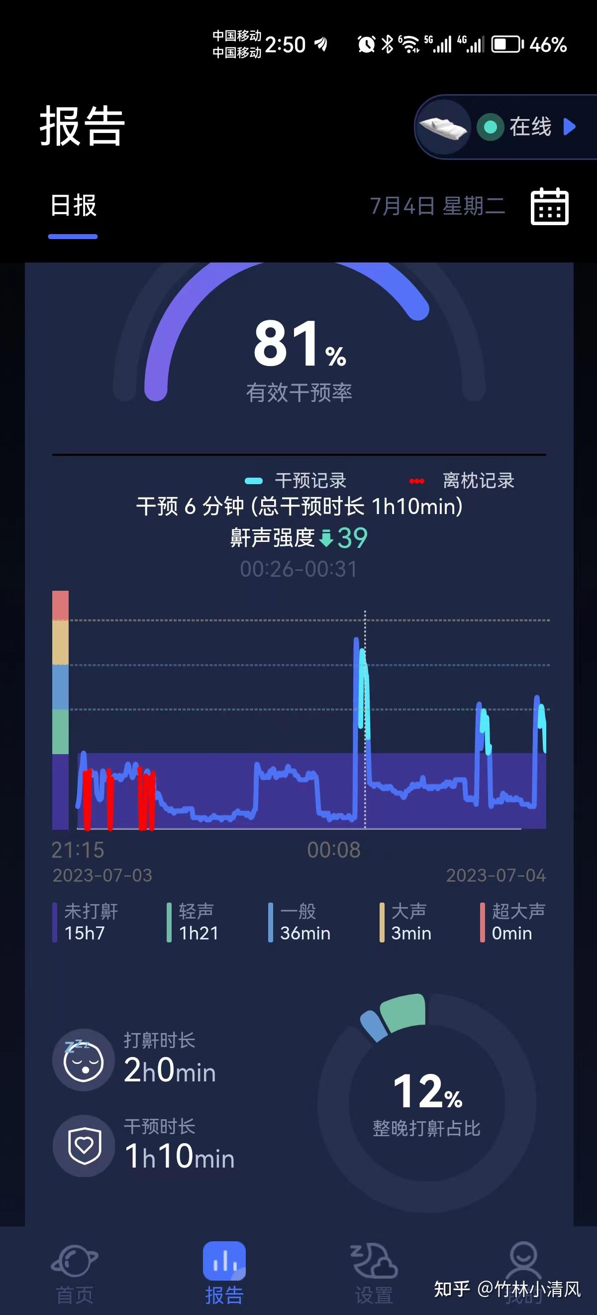 2023.7.4 睡眠12小时,总打鼾时长不足2小时。整晚打鼾占比只有12%,打鼾率(打鼾总时长眠总时长)从原来的27.82%下降至7%,效果很显著!