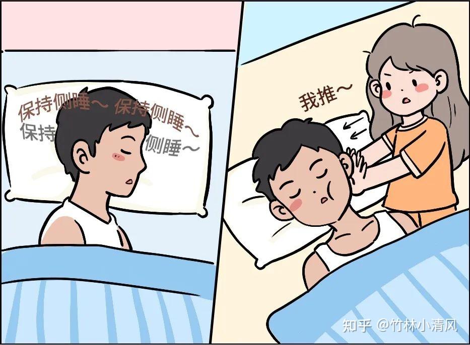 侧身睡能使阻塞咽喉部气道的软腭倾倒一边,堆积在咽部气道的组织打开了一条缝,从而扩大了气道,增加了通气量,使睡眠时的呼吸变得相对更加顺畅。