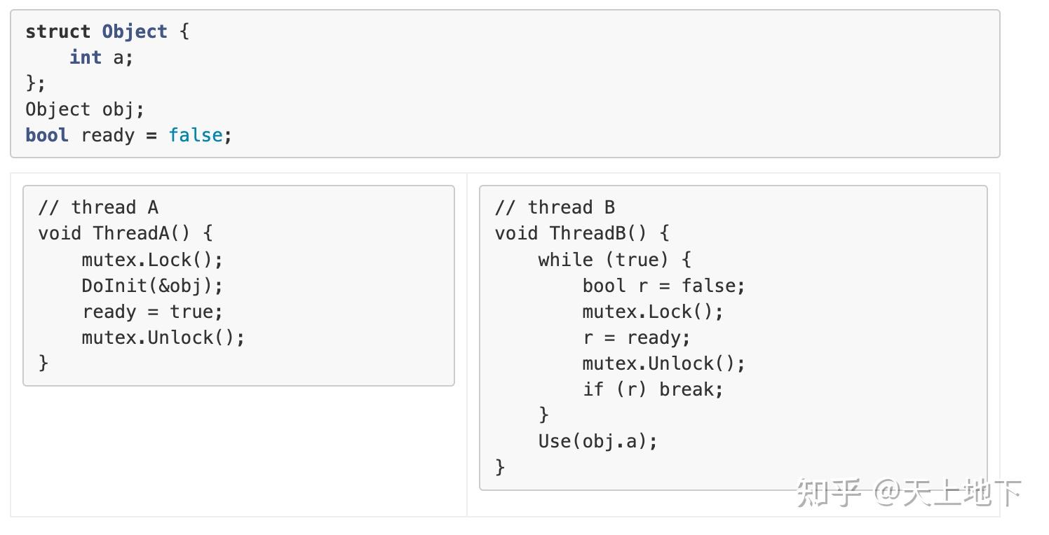 所以首要的问题是 memory order 是什么? 以及为啥 c++ 要引入 memory order? 首先来看一个场景: 现在有线程 A, B; A 作为生产者, 其会负责某个对象 obj 的初始化工作, 在完成初始化之后, 设置 flag ready 告诉消费者 B, 对象准备就绪, 可以使用了. 用 mutex 实现如下:
