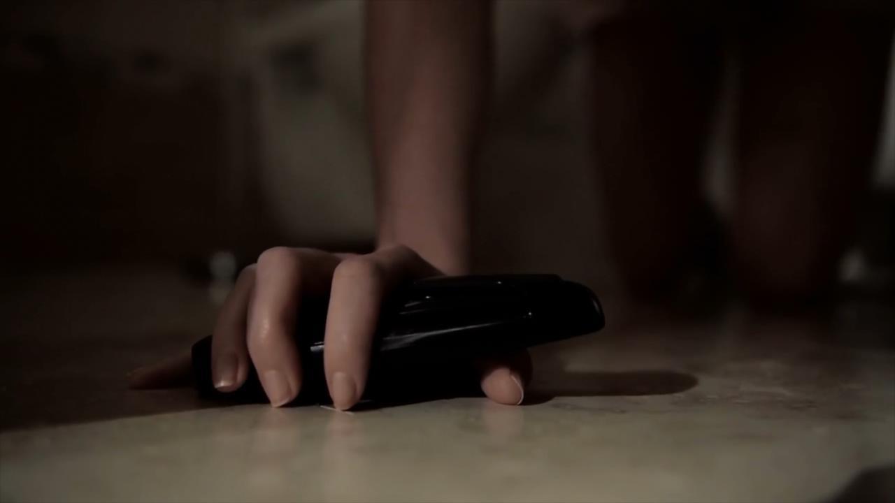 女主报警通过无绳电话,当他看到地上的手机,丈夫的来电,接都不接,到厨房找到菜刀往楼上跑……