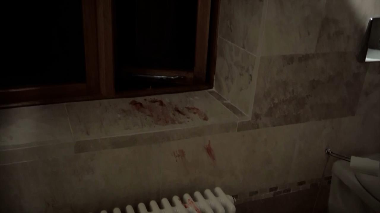 再看这个镜头,我们发现卫生间没有门,二楼的门在走廊外……