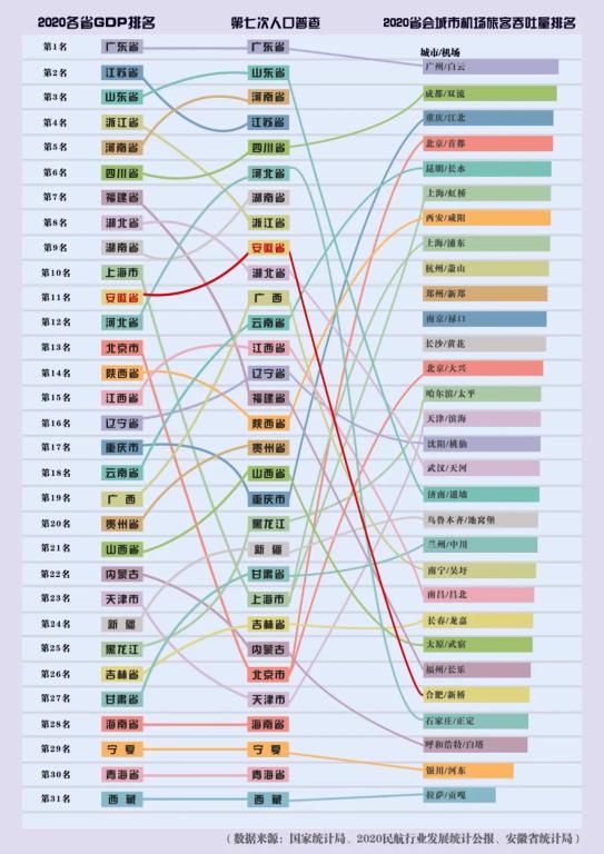 如今的安徽已早就摆脱经济“总量居中、人均落后”的尴尬境地,“总量居前、人均居中”已是安徽在区域格局中所获得的新地位。随着2021年上半年GDP超越上海后,今年安徽全年GDP总量将再上一个台阶,站稳全国前十的位置;同时根据第七次全国人口普查的数据,安徽常住人口以6100多万排名全国第9。那么为何经济总量靠前、人口居住量也靠前,安徽的民航客流却是全国倒数?是安徽人坐不起飞机?还是安徽人没有坐飞机的习惯?显然,经济与人口总量与民航客流、货流数据的完全倒挂另有他因。