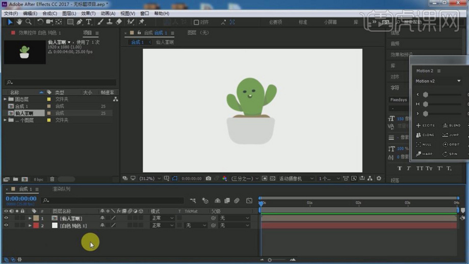 7.在进入仙人掌合成中,将图层的时间轴后移,再给土图层的【缩放】分别设为双0和双100分别打上打上关键帧,在选择关键帧点击【Motion2】-【EXCITE】在调整【滑块】的参数,在按【F9】添加缓动。