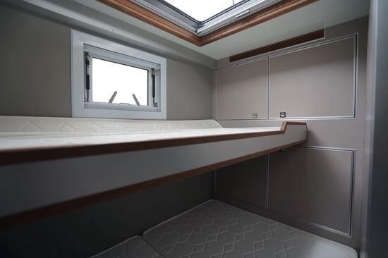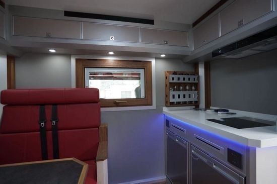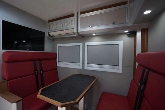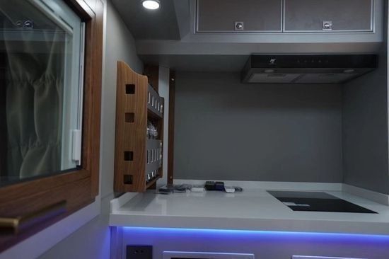 车内实木(美国红橡)搭配拉丝铝板家具+环保型房车专用柚木地板革;布局方面,采用了会客区对卡座沙发+气动升降餐桌+实木组合式橱柜+卫生间+车尾横置上下床的布局结构设计,全车的储物空间非常丰富,对于长期户外旅游者来说实用性高。暖色系氛围更贴近居家效果,让成员即使在外旅行也能感受到住家的感觉。会客区真皮软包对卡座沙发满足4人乘坐,卡座沙发搭配气动升降餐桌可变为一张沙发床;固定式安全带保护行车途中乘客的人身安全。坐垫厚实,弧形靠背也提供一定的支持感,整体来说乘坐舒适感还是不错的;沙发内侧墙壁2个独立外推窗,提供采光及通风换气效果;格力24V变频空调制冷效果快,可手动调节温度;吊柜方便日常收纳物品。