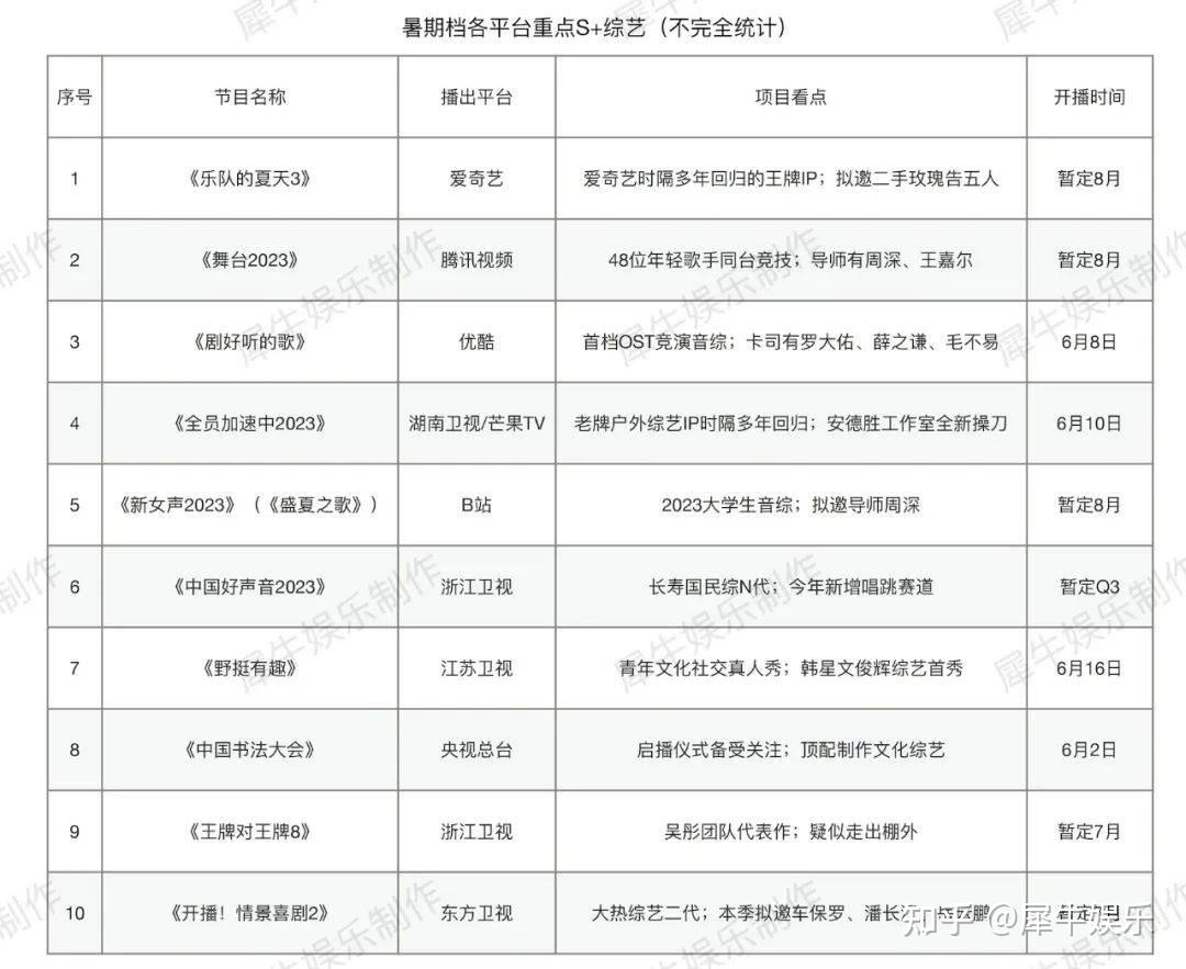 根据犀牛君统计,今年暑期档台网各平台都会至少推出一档举平台之力制作的S+,这场各平台项目的巅峰对决大概有10名种子选手参赛。(见下表)