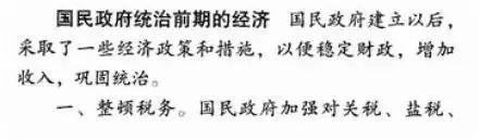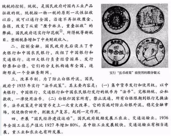 对国民政府时期的经济建设和工业成就,历史教科书同样是讲民族工业发展,肯定了国民政府时期民族工业发展的成就,1936年工业产值比1927年增长80%,然而教科书除了提到一句“以上海为中心的民族资产阶级在经济上是国民政府的主要支持者”以外,全文压根没有提到全国民族工业分布,也根本没有提到什么地名。