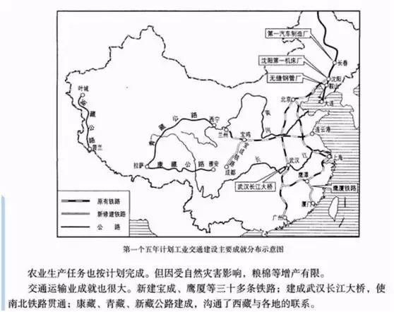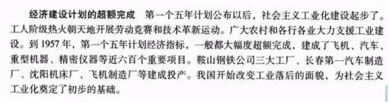 下面是历史教科书对建国后中国工业建设的描写,总共就讲了两页,下面是第一页,总共只提到了三个地名,鞍山,长春,沈阳,全部是东北的城市,提到了六个工厂,全部在东北,该页配了两张图,一张是长春一汽,一张是沈阳沈飞。