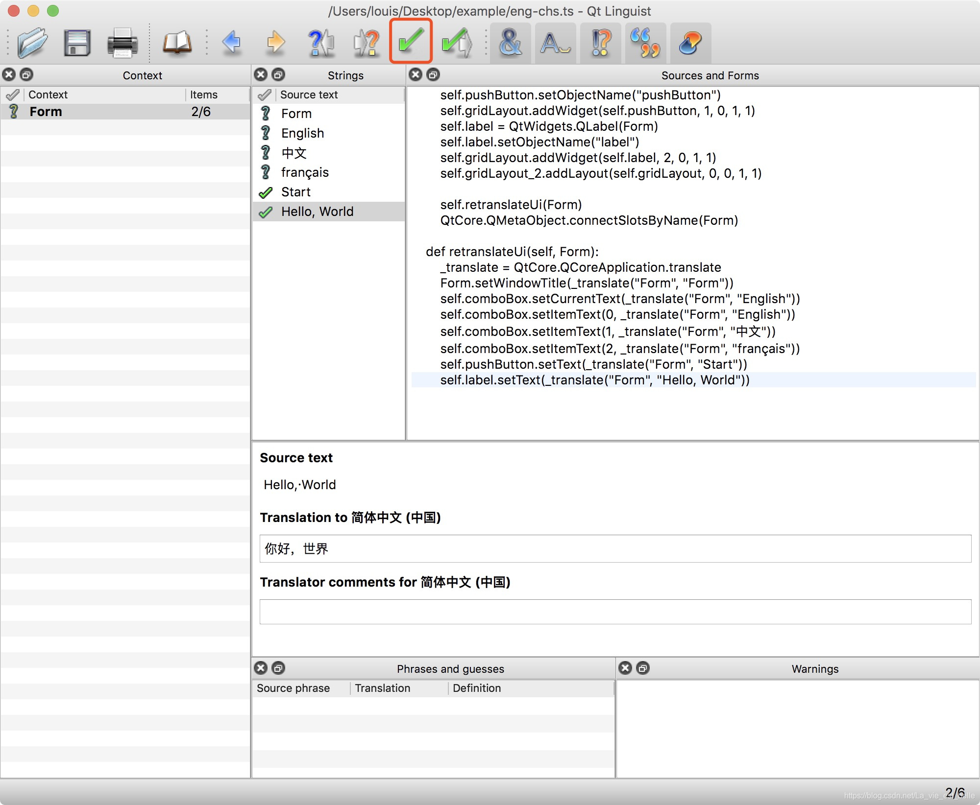 我们接下来将源文翻译好,如果确保翻译无误的话,可以点击红框中的打勾图标(QComboBox中三个选项我们就是不必翻译的,窗口标题Form我们也就不翻了,主要就是翻译用来演示用的Start和Hello, World):