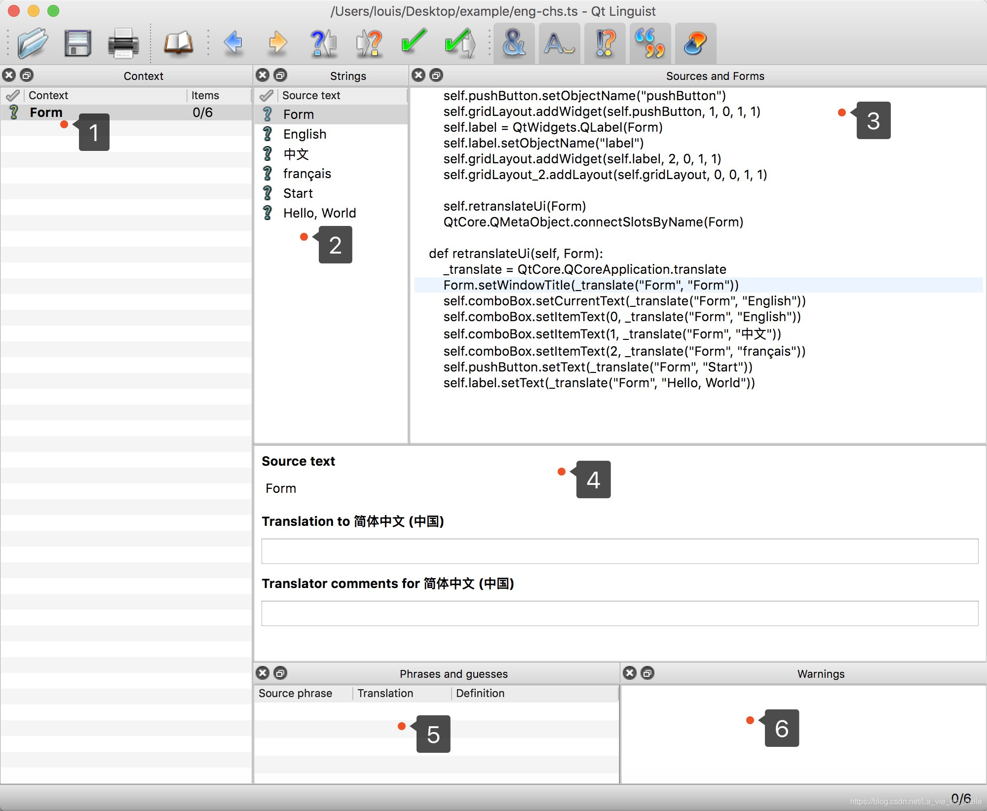 1. 上下文窗口:其中每个上下文中都包含一个或多个要翻译的源文,从这里我们看出Form上下文中包含6个源文。