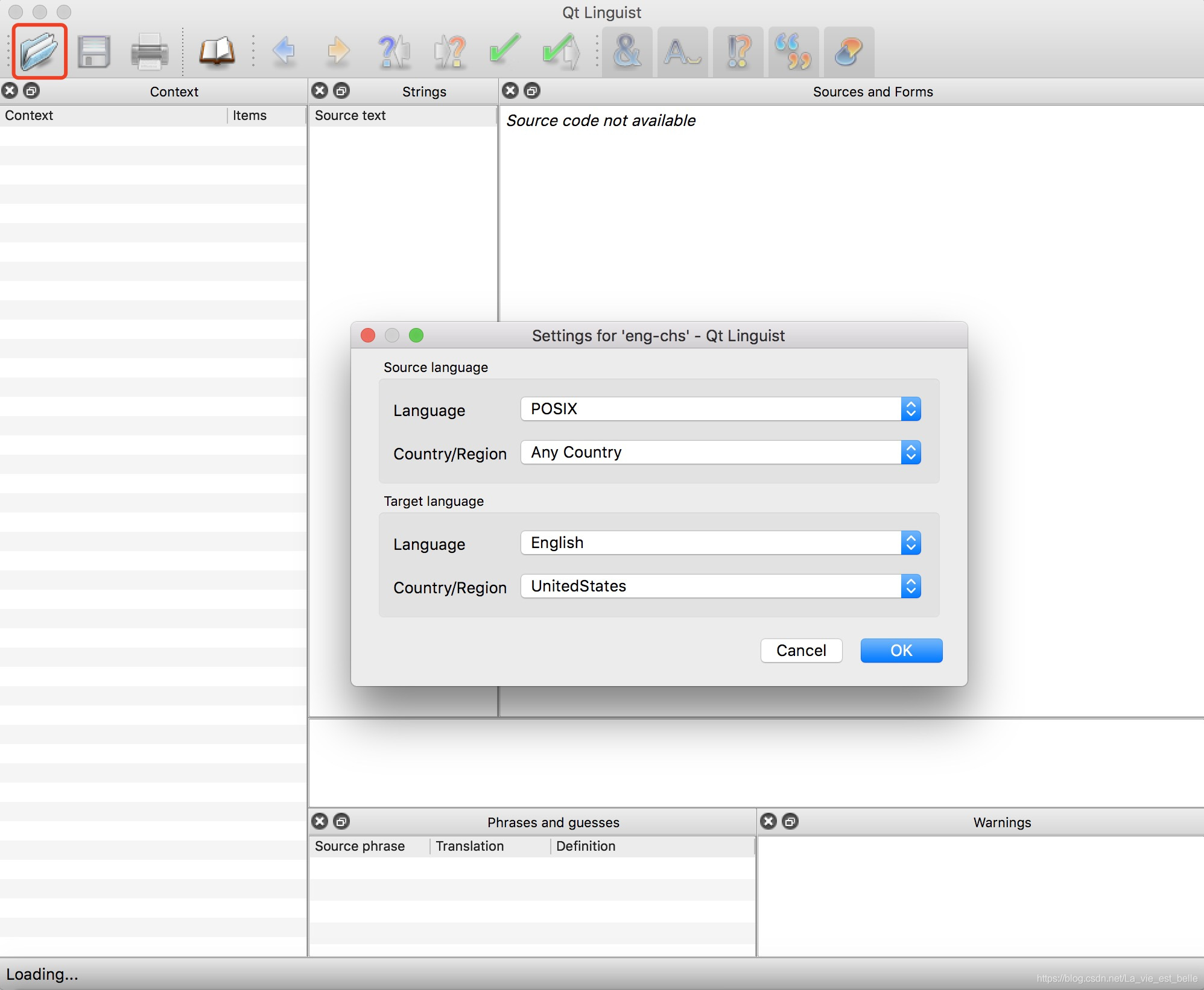 我们打开Qt Linguist,点击左上角的文件夹图标,找到我们的eng-chs.ts文件并打开,之后屏幕中会出现一个语言和地区设置弹框: