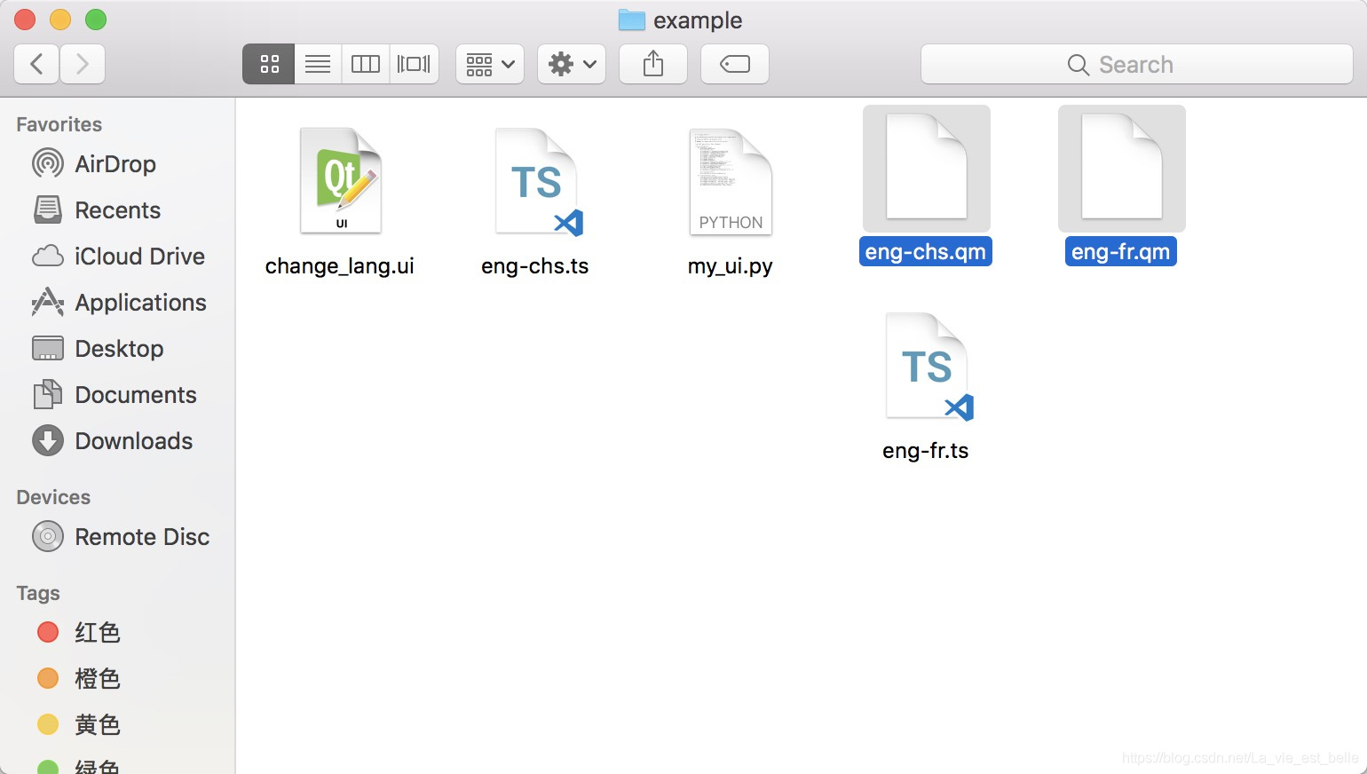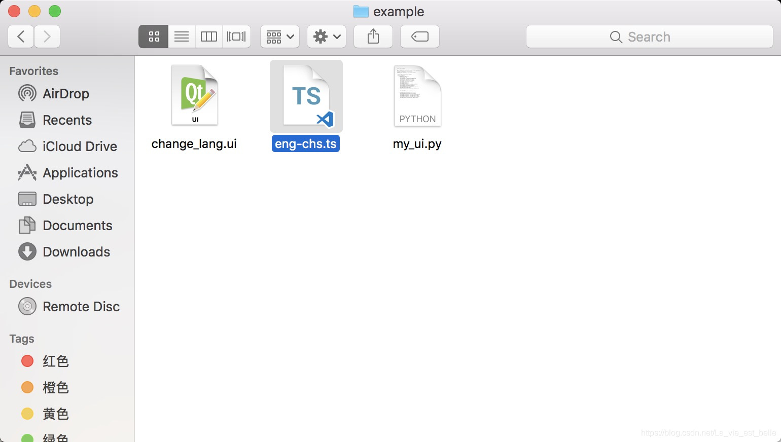 也就是说当我们选择QComboBox中不同项时,界面的文本翻译会随之变化,这就是该程序要演示的效果。笔者设计好界面后,将其保存到了桌面的example文件夹中,UI文件命名为change_lang.ui。