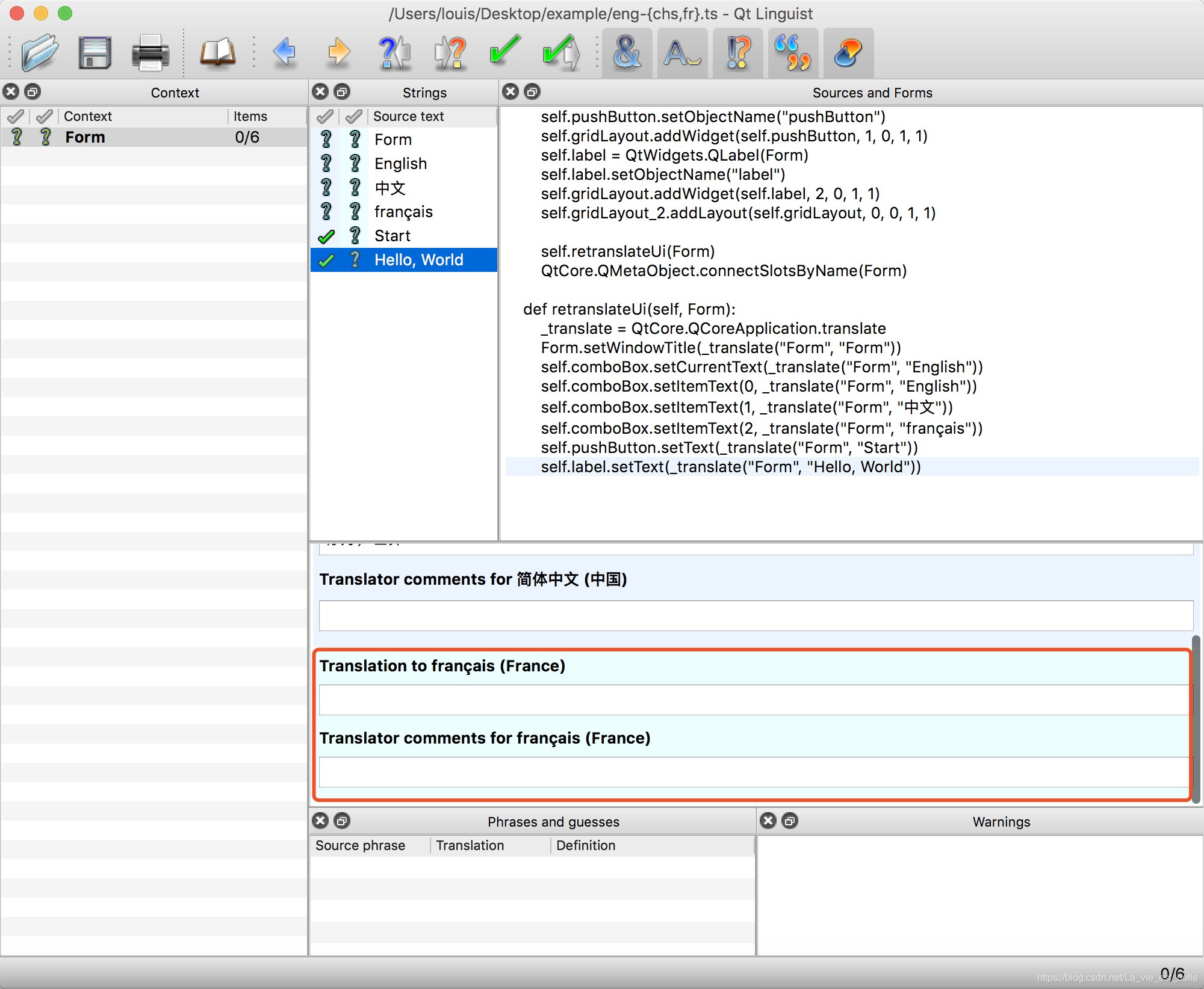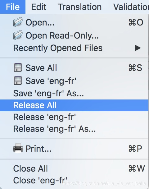 同样我们将法语译文输入进去,确保没问题后,点击上方的绿勾,最后我们点击File菜单中的Release All进行发布,之后会在项目目录中生成一个eng-chs.qm文件和一个eng-fr.qm文件。这两个文件就是我们需要在程序中进行载入的: