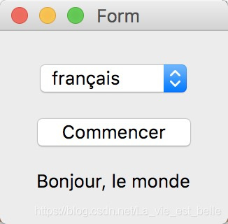 我们就放入一个QComboBox控件、一个QPushButton控件以及一个QLabel控件。将文本设置好,QComboBox中包含三项,分别是:English,中文,français
