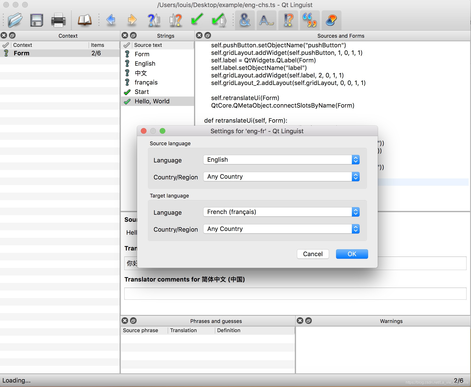 中文的翻译已经好了,我们接下来重复29.2创建ts文件步骤,生成一个eng-fr.ts文件并用Qt Linguist打开,进行语言和地区设置: