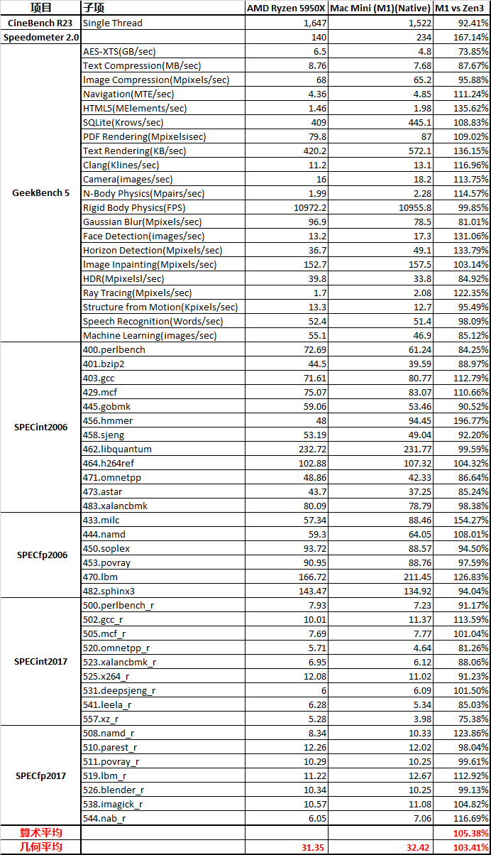 从这些测试项目综合来看,M1的确是稍微强于5950X的,但你要说真赢了,就算是归一后算术平均下来,也就胜出5%多点。