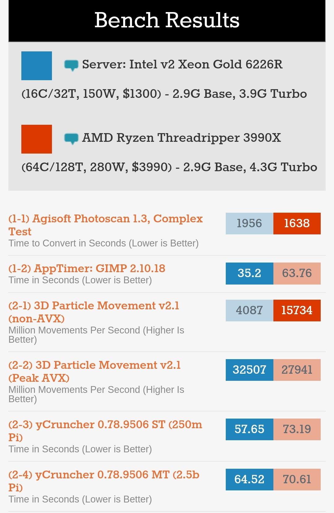 说实话,真要说高性能计算吧,Intel还真可以说一句“你大爷还是你大爷”,不管是linpack还是例如3dpm、yCruncher这类应用,只要数据结构适合SIMD,avx512加上mesh的SKL-X/SP,哪怕工艺落后一代,架构还是四五年前的,Zen2核心数量两倍甚至四倍也要输,按照Zen3的表现,估计也赢不了。随手找两个评测: