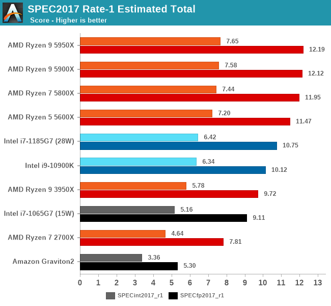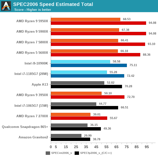 Since our A14 results, we’ve been able to track down Apple’s compiler setting which increases the 456.hmmer by such a dramatic amount – Apple defaults the “-mllvm -enable-loop-distribute=true” in their newest compiler toolchain whilst it needs to be enabled on third-party LLVM compilers. A 5950X with the flag enabled increases its score to 91.64, but also while seeing some regressions in other tests. We haven’t had time to re-test further platforms.