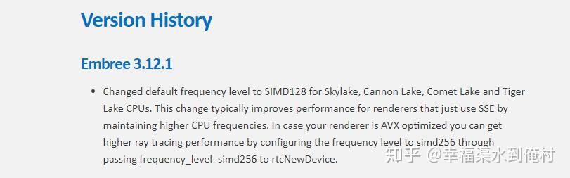 另外。众所周知,R23修改了SIMD指令的数据宽度,在新的Embree文档里,有这样的说明。