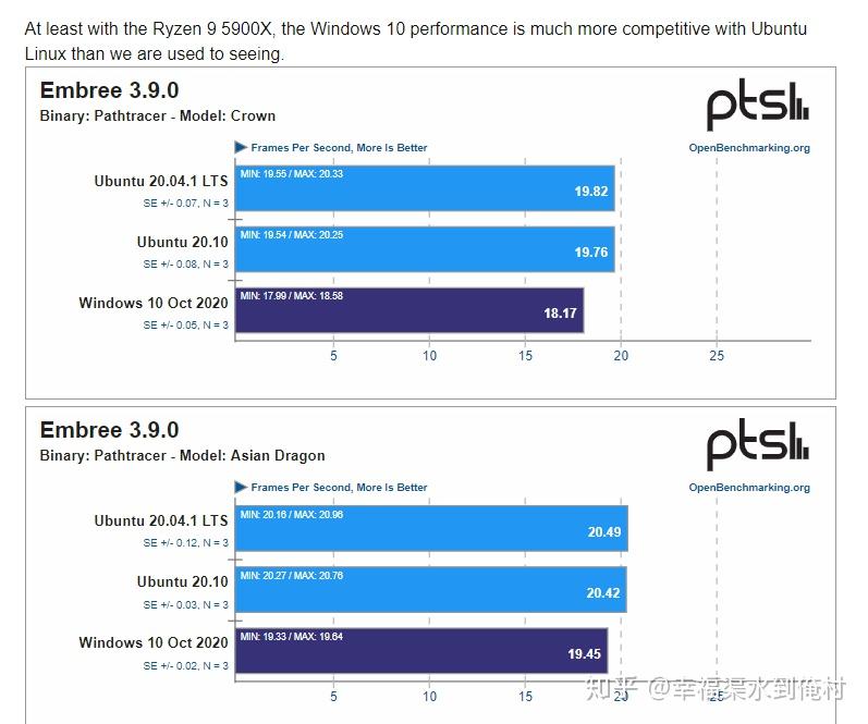 但是我不清楚Phoronix是否开启了透明大页,毕竟不是所有Linux发行版都默认打开这个设置的。就当一个不同系统下Embree的跑分差异吧,权当验证intel的说法。事实上,Phoronix测试的所有渲染项目里,不仅是Embree,其他的渲染项目,Windows10一般都会落后很多。不太清楚具体原因。