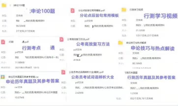 在备考过程中整了一些超级好的资料,每一份资料都是精心整理出来的!希望对大家有帮助, 具体包括: 申论历年真题+行测历年真题+公务员考试词语辨析大全+行测基础通+公考高效复习方法+申论技巧与热点解读+行测学习视频+申论学习视频+申论100题+分论点段旨句常用模板。