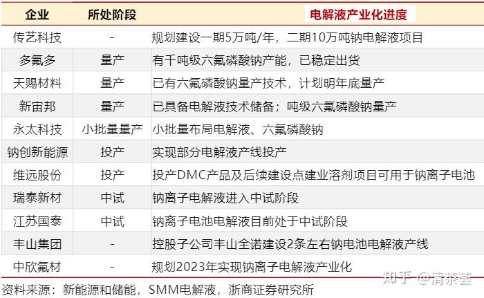 - 电解液:传艺科技规划建设一期5万吨/年,二期10万吨钠电解液项目,多氟多、天赐材料、新宙邦及永太科技等公司已经开始规划量产。