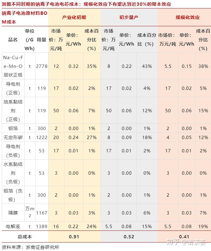 已经制备的钠离子电池具有宽工作温度范围:-70-100℃;钠离子电池当前小试、中试电芯成本在0.8-1元/Wh范围内波动,预计产业链配套初步形成后,电芯成本有望下降到0.5-0.6元/Wh,中长期进一步下探0.4-0.5元/Wh,达到近30%的降本效应。