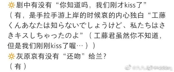 青山老贼你要不要看看自己写什么?柯哀亲了你说是人工呼吸,OK可以接受。那灰原哀后面把吻还给毛利兰又是什么骚操作?!而且毛利兰灰原哀两个那么出彩的角色给你写成什么了?一个日本王宝钏和一个绿茶小三?!(气到小编掐人中……)