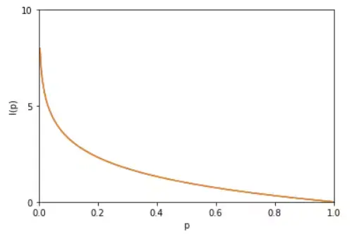 因为两个事件是独立不相关的,因此 p(x,y)=p(x)p(y)。根据这两个关系,很容易看出 I(x) 一定 与 p(x) 的 对数有关 (因为对数的运算法则是 loga(mn)=logam+logan因此,我们有I(x)=−logp(x)。 其中负号是用来保证信息量是正数或者零 。 而 log函数基的选择是任意的 (信息论中基常常选择为2,因此信息的单位为比特bits;而机器学习中基常常选择为自然常数,因此单位常常被称为奈特 nats )。I(x)也被称为随机变量 x的 自信息 ( self-information ), 描述的是随机变量的某个事件发生所带来的信息量 。图像如图: