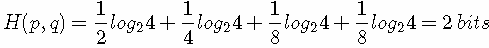 那么这些定义有着什么样的性质呢?考虑一个随机变量 x。这个随机变量有4种可能的状态,每个状态都是等可能的。为了把 x 的值传给接收者,我们需要传输2比特的消息。H(X)=−4×(1/4)log2(1/4)=2 bits。现在考虑一个具有4种可能的状态 {a,b,c,d} 的随机变量,每个状态各自的概率为 (1/2,1/4,1/8,1/8)。这种情形下的熵为:
