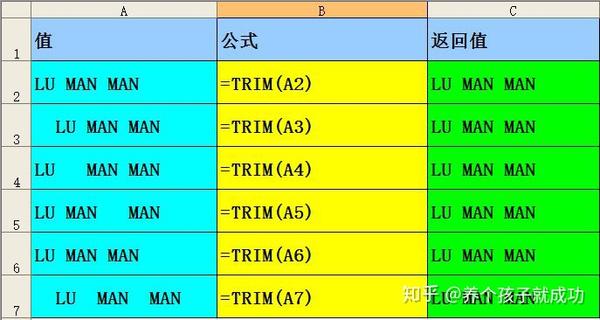 可见TRIM不仅可以去除前后的空格,也可以去除中间的多余空格。此函数同样返回的是文本。此函数可以用于校验输入是否有多余的空格。比如在做inputbox输入时,可以加上这个函数,以应对不小心的手颤抖多录入的空格,而空格在后台是完全作为一个值来处理的。