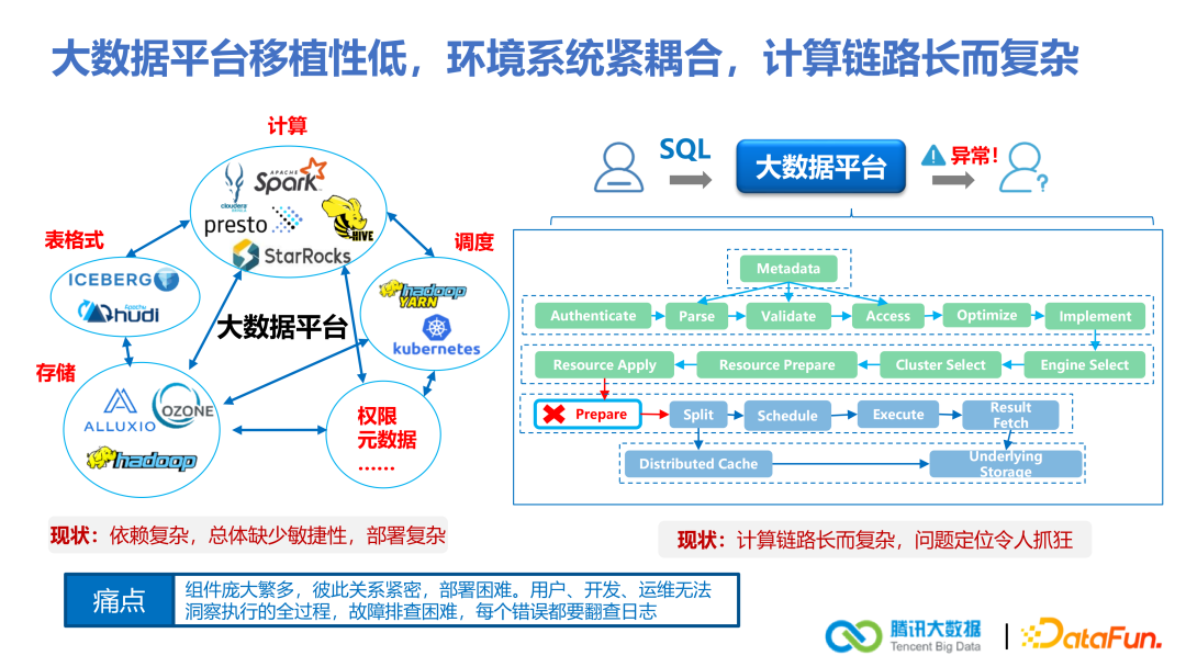 大数据平台组件包括调度、权限管理、存储管理及计算引擎等,导致一条 SQL 的计算链路长且复杂。平台用户对底层的细节又不甚了解,用户提交 SQL 后一旦发生问题,很难定位,用户、开发、运维无法洞察执行的全过程,导致运维成本很高,需要一个统一的大数据解决方案来处理这个问题。