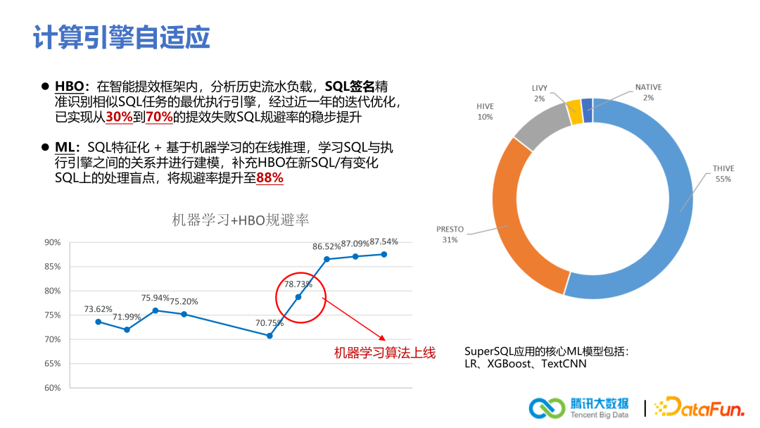 在计算引擎的自适应方面,HBO 目标是分析处理历史用户 SQL 流水,降低提效失败的 SQL 数,经过近一年的迭代优化,已实现从 30% 到 70% 的失败规避率。机器学习算法可以自动学习 SQL 特征,更好地弥补人为规则的黑角。 把 HBO 和机器学习结合起来 ,可以更好地降低日均提效失败的 SQL 数,将规避率提升至 88%,减少引擎集群无效负载的同时节省宝贵的计算资源。