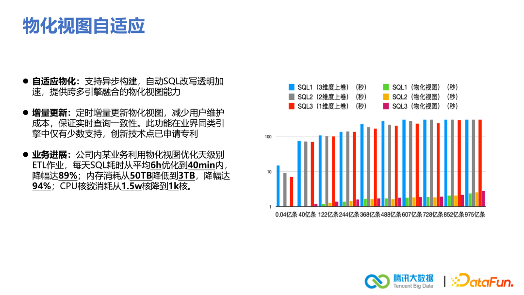 在物化视图自适应方面,支持异步构建,自动 SQL 改写透明加速,提供跨多引擎融合的物化视图能力,同时定时增量更新物化视图。 公司内某业务利用物化视图优化天级别 ETL 作业,每天 SQL 耗时从平均 6h 优化到 40min 内,降幅达 89%;内存消耗从 50TB 降低到 3TB,降幅达 94%;CPU 核数消耗从 1.5w 核降到 1k 核。