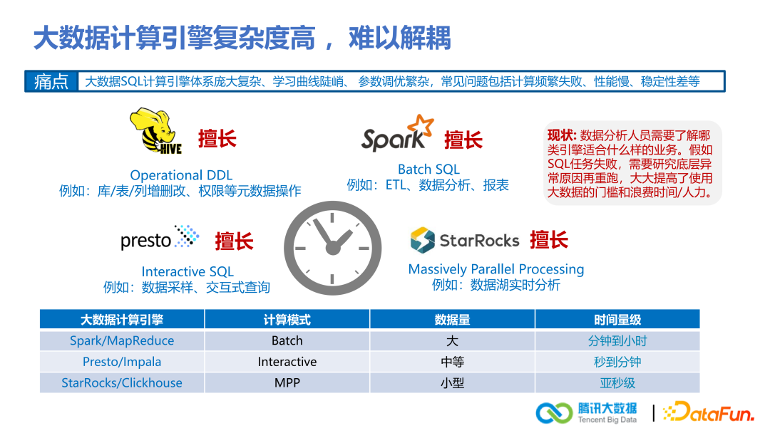 大数据计算引擎庞大复杂,不同的引擎参数调优繁杂,学习曲线陡峭。不同的引擎适合不同的业务,如 Hive 适用于对可靠性要求比较高但对时间要求不高的应用。Spark 适用于 ETL、报表等场景。Presto 和 impala 适用于秒级和分钟级的交互式查询。StarRocks 提供亚秒级到秒级实时数据处理。数据分析人员需要根据不同的数据结构和数据量以及响应时间挑选不同的引擎,这大大提高了使用大数据的门槛。