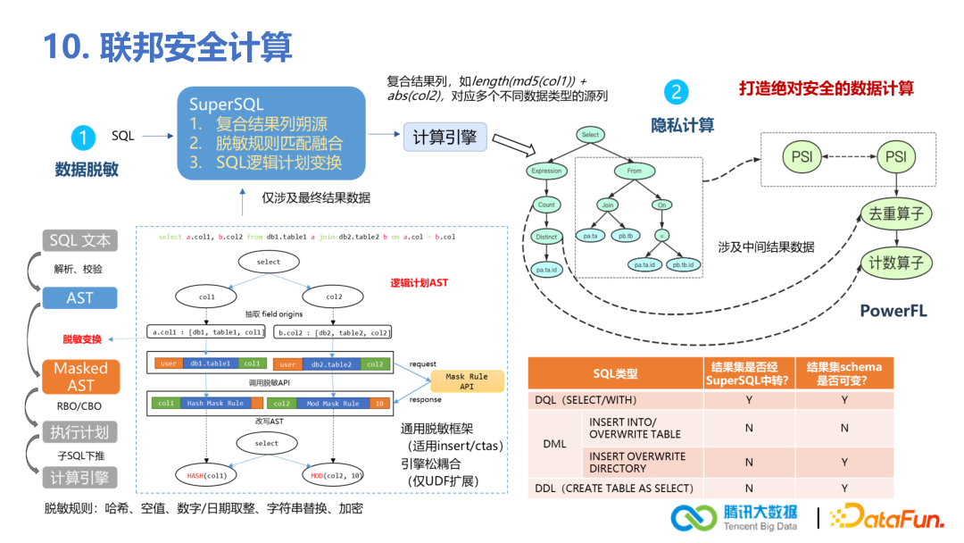 关于联邦安全计算工作主要涉及两个方面。一个是 数据脱敏 ,对于用户不能看到的复合结果列数据,首先对结果列进行溯源,并基于不同的脱敏规则(如哈希、数值取整,字符串替换、加密等)统一在 SuperSQL 层数据脱敏,而不需要每个引擎都实现这个脱敏规则。另一个工作是 隐私计算 ,通过在计算引擎上实现的算子,实现中间结果数据的安全计算。