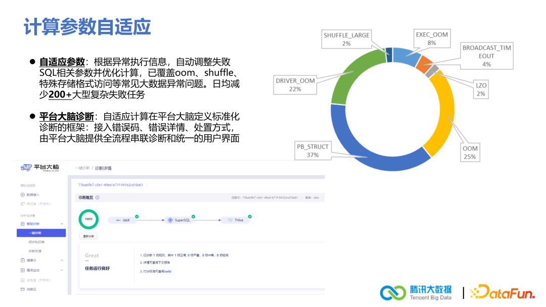 在计算参数自适应方面,将参数设置分为事前和事后两部分 ,在任务执行前,我们基于 HBO 的信息做参数预测。任务执行后,平台大脑定义标准化诊断的框架,提供全流程串联诊断和统一用户界面。根据异常执行信息,自动调整失败 SQL 相关参数并优化计算,已覆盖 OOM、Shuffle、特殊存储格式访问等常见大数据异常问题。