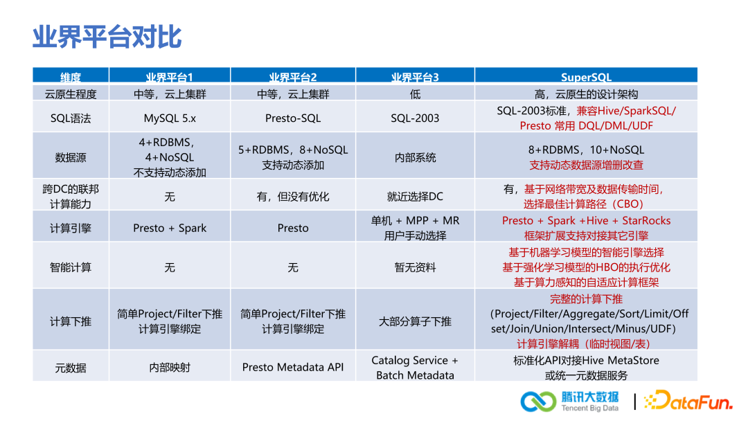 SuperSQL 是腾讯大数据的下一代自适应计算平台。通过开放融合的架构,实现一套代码自适应解决公有云、私有云、内网的任何大数据计算问题。